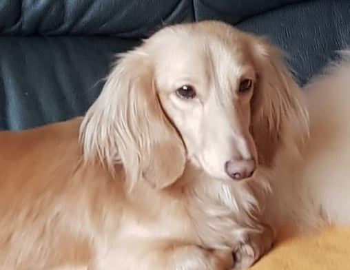 Forest Sun Dackel Jodok ist ein ein echter Hingucker in Langhaar mit der seltenen Farbe Cream Clear. Nebst seinem strahlendem Weiss, vererbt Jodok auch Chocolate und Piebald. Jodok ist ein sehr cleverer Kaninchendackel mit 4 kg. Klein aber oho beschreibt seinen Charakter am besten. Voller Elan, Tatendrang und immer gut gelaunt geht er durch den Tag. Mit seinem Charme und Witz wickelt er Jedermann, Frau und Hund um die Hand/Pfote. Jodok ist sehr gut verträglich mit anderen Hunden und Kindern. Er liebt es in der Sonne zu liegen oder zu schmusen.